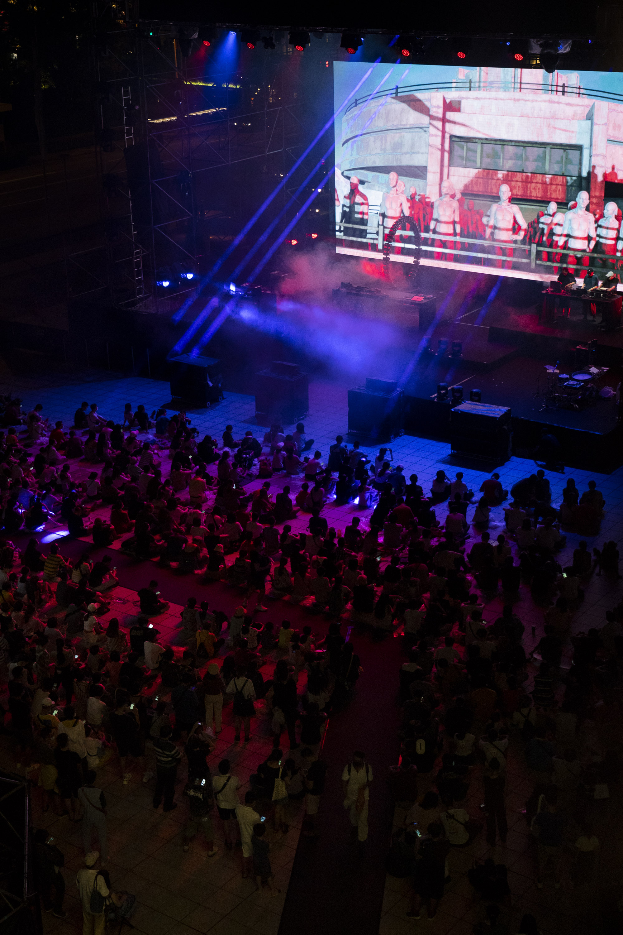 Hēi Yè is a work that merges visuals, experimental sounds,synthesizers, and sampling and modulation to create a visible performance of auditory perception. Under the surface of the conscious and unconscious, a full-range of sounds is stacked up with unpredictable turbulence of analog and digital in timely response. The shifting visuals in giant spomenik drive our sense. The focus is on the energy conversion of consciousness and perception through the amplification and modulation of analog and digital signals. And it transforms consciousness into crowd mobility and gathering in visuals. Listeners re-form the purely sensory soundscape through intra-brain resonance from unstructured and irregular full-range sounds.